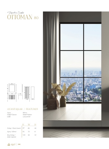 Premium Serie OTTOMAN 80 700 950 250 800 2050 495 1390 1790 850 400 370 AVANTAJLAR / FEATURES Ayna Mirror Rölyef Desen- Relief Patern- Lake Lacquered H W D Dolap / Wash basin 57 80 46 Ayna / Mirror 95 70 4 Boy Dolap / 139 38 32 Side Cabinet 100