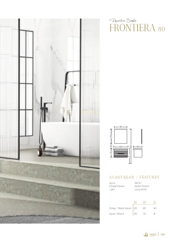 Premium Serie FRONTIERA 80 700 800 300 800 1930 460 490 830 AVANTAJLAR / FEATURES Ayna Mirror Rölyef Desen- Relief Patern- Lake Lacquered H W D Dolap / Wash basin 83 80 46 Ayna / Mirror 80 70 4 103
