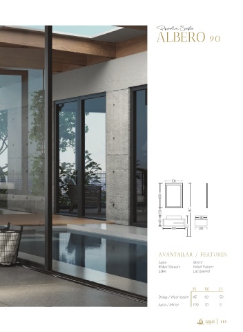 Premium Serie ALBERO 90 700 1000 320 2150 460 410 830 900 500 AVANTAJLAR / FEATURES Ayna Mirror Rölyef Desen- Relief Patern- Lake Lacquered H W D Dolap / Wash basin 45 90 50 Ayna / Mirror 100 70 5 113