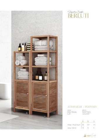 Premium Serie BERLUTI AVANTAJLAR / FEATURES Ayna Mirror Rölyef Desen- Relief Patern- 5 Lake Lacquered 6 H W D Dolap / Wash basin 83 107 51 Ayna / Mirror 73 70 5 117