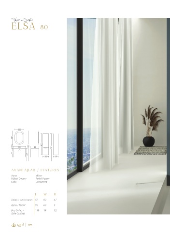 Trend Serie ELSA 80 600 900 260 800 1990 465 1400 1790 575 830 380 320 AVANTAJLAR / FEATURES Ayna Mirror Rölyef Desen- Relief Patern- Lake Lacquered H W D Dolap / Wash basin 57 80 47 Ayna / Mirror 90 60 5 Boy Dolap / 139 38 32 Side Cabinet 130