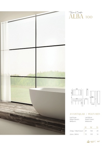 Trend Serie ALBA 100 1000 150 690 410 1390 1000 1930 455 1790 590 830 380 320 AVANTAJLAR / FEATURES Led Ayna Led Mirror Rölyef Desen Relief Patern Melamin Melamine H W D Dolap / Wash basin 49 100 45 Ayna / Mirror 70 100 16 167