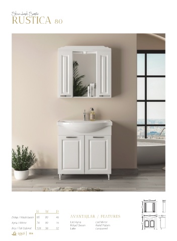 Standart Serie RUSTICA 80 800 174 738 H W D Dolap / Wash basin 85 80 46 AVANTAJLAR / FEATURES 342 800 1930 460 Ayna / Mirror 74 80 16 Led Ayna Led Mirror 850 Rölyef Desen Relief Patern Boy / Tall Cabinet 139 38 32 Lake Lacquered 184