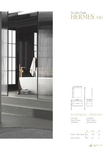Exclusive Serie HERMES 100 700 900 1000 2000 460 830 AVANTAJLAR / FEATURES Led Ayna- Led Mirror- Rölyef Desen- Relief Patern- Lake Boya Lacquer Paint H W D Dolap / Wash basin 47 100 46 Ayna / Mirror 90 70 4 33