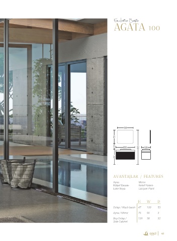 Exclusive Serie AGATA 100 900 750 320 1000 1930 500 860 AVANTAJLAR / FEATURES Ayna Mirror Rölyef Desen- Relief Patern- Lake Boya Lacquer Paint H W D Dolap / Wash basin 47 100 53 Ayna / Mirror 75 90 3 Boy Dolap / 139 38 32 Side Cabinet 41