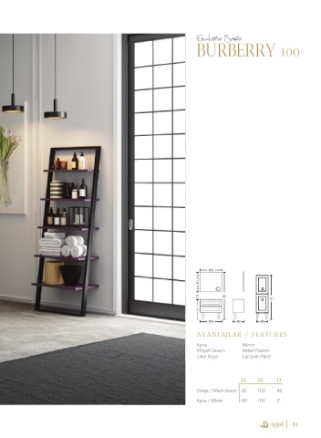 Exclusive Serie BURBERRY 100 1000 800 315 1930 1400 815 1000 460 400 AVANTAJLAR / FEATURES Ayna Mirror Rölyef Desen- Relief Patern- Lake Boya Lacquer Paint H W D Dolap / Wash basin 82 100 46 Ayna / Mirror 80 100 3 51