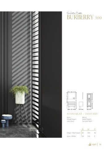Exclusive Serie BURBERRY 100 1000 800 315 1930 1400 815 1000 460 400 AVANTAJLAR / FEATURES Ayna Mirror Rölyef Desen- Relief Patern- Lake Boya Lacquer Paint H W D Dolap / Wash basin 82 100 46 Ayna / Mirror 80 100 3 53