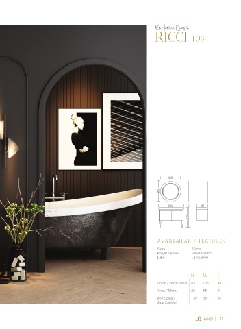 Exclusive Serie RICCI 105 850 850 1050 1930 480 830 AVANTAJLAR / FEATURES Ayna Mirror Rölyef Desen- Relief Patern- Lake Lacquered H W D Dolap / Wash basin 83 105 48 Ayna / Mirror 85 85 4 Boy Dolap / 139 38 32 Side Cabinet 55