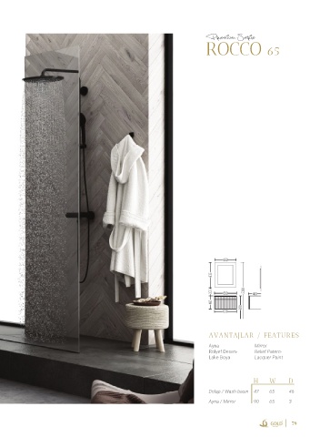 Premium Serie ROCCO 65 650 900 300 650 2030 460 465 830 638 AVANTAJLAR / FEATURES Ayna Mirror Rölyef Desen- Relief Patern- Lake Boya Lacquer Paint H W D Dolap / Wash basin 47 65 46 Ayna / Mirror 90 65 3 79