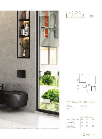 Premium Serie LUCCA 85 850 700 300 850 2130 460 400 830 AVANTAJLAR / FEATURES Ayna Mirror Rölyef Desen- Relief Patern- PVC PVC H W D Dolap / Wash basin 40 85 46 Ayna / Mirror 70 85 3 Boy Dolap / 139 38 32 Side Cabinet 89