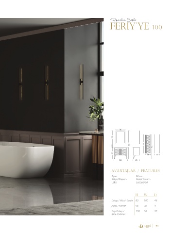 Premium Serie FERIY'YE 100 700 950 260 2050 1390 1790 840 400 370 1000 495 AVANTAJLAR / FEATURES Ayna Mirror Rölyef Desen- Relief Patern- Lake Lacquered H W D Dolap / Wash basin 83 100 46 Ayna / Mirror 95 70 4 Boy Dolap / 139 38 32 Side Cabinet 91
