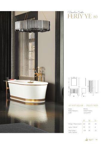 Premium Serie FERIY'YE 80 700 950 260 2050 1390 1790 840 400 370 800 495 AVANTAJLAR / FEATURES Ayna Mirror Rölyef Desen- Relief Patern- Lake Lacquered H W D Dolap / Wash basin 83 80 46 Ayna / Mirror 95 70 4 Boy Dolap / 139 38 32 Side Cabinet 93